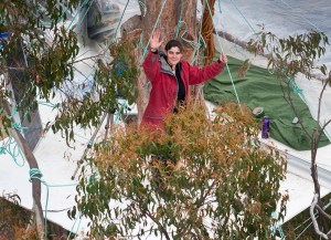 こんにちは。私の名前はミランダ・ギブソンです。オーストラリアのタスマニア島に住んでいます。いまわたしはオールドグロス林の樹上 60 メートルの高さに座っているところです。2011年12月14 日にこの樹に登りました。周囲の森が保護されるまで地上に降りないと誓ったのです。