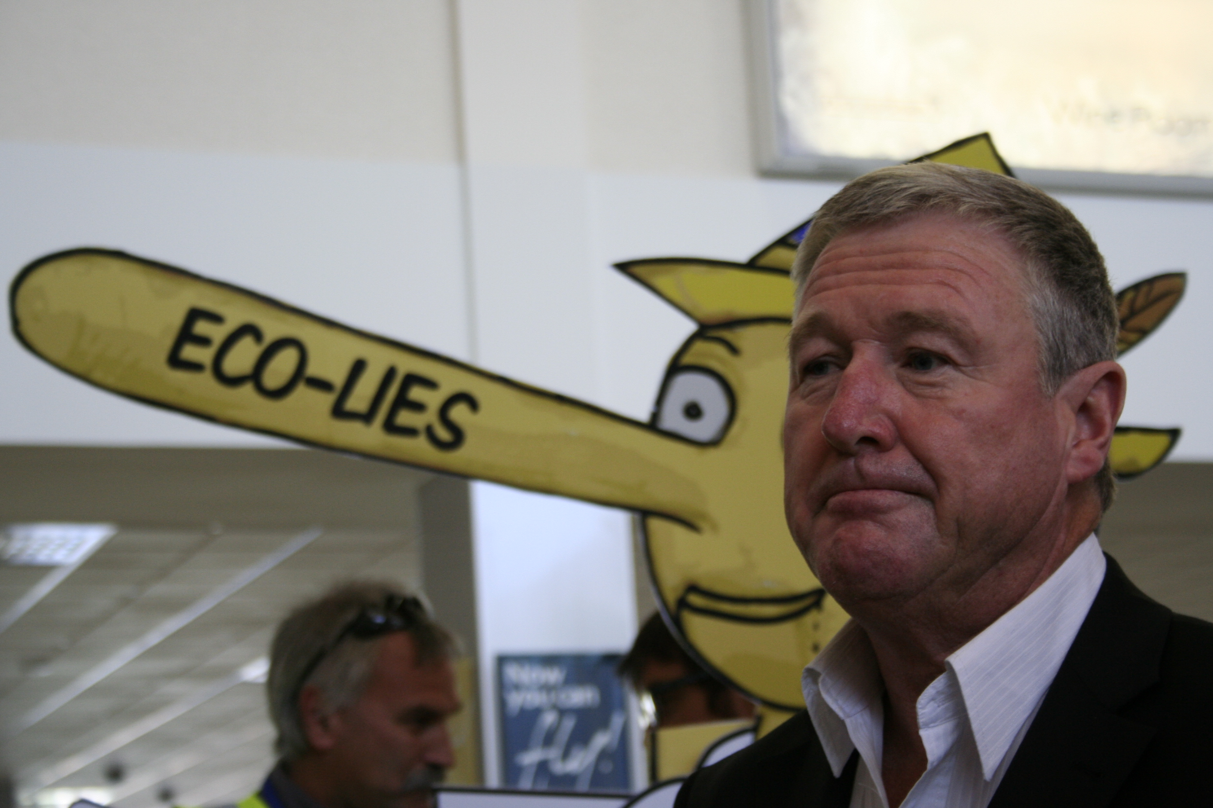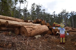 Pinocchio was not fooled by the greenwashing though. In the last few days he as been on a tour of Tasmania, seeing for himself the destruction that is occurring. Pinocchio visited to devastating clearfells and logging operations, where the wood from high conservation value forests is destined for the veneer mills of Ta Ann. Armed with these cold hard facts, Pinocchio stood beside Bryan Green at the Launceston airport and called Ta Ann for what they are: eco-liars.