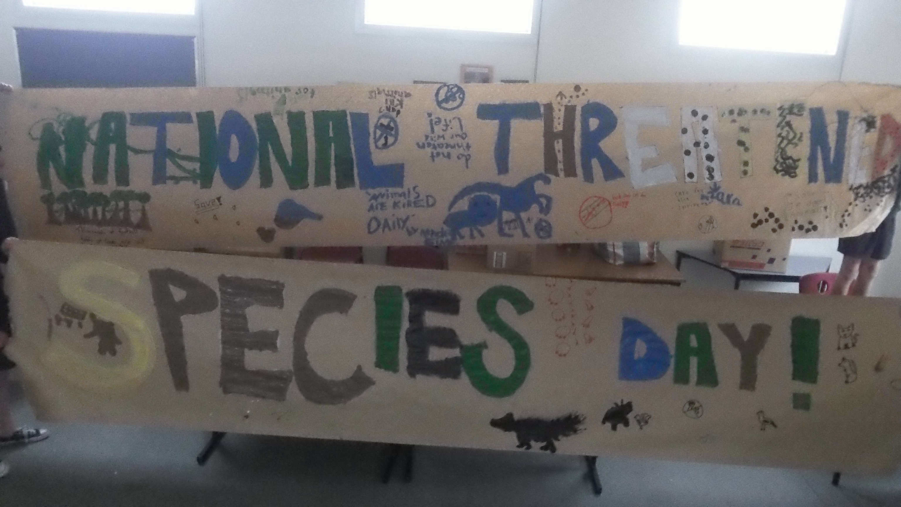 Yesterday at Cygnet Public Primary School a group of students gave up their lunchtime for National Threatened Species Day to talk about threatened and injured wildlife in Tasmania. While they were painting a banner with their messages for other students who don’t live near the bush, Shaun Douglas, a grade 6 Teacher’s Aide interviewed the group and this is what they had to say: