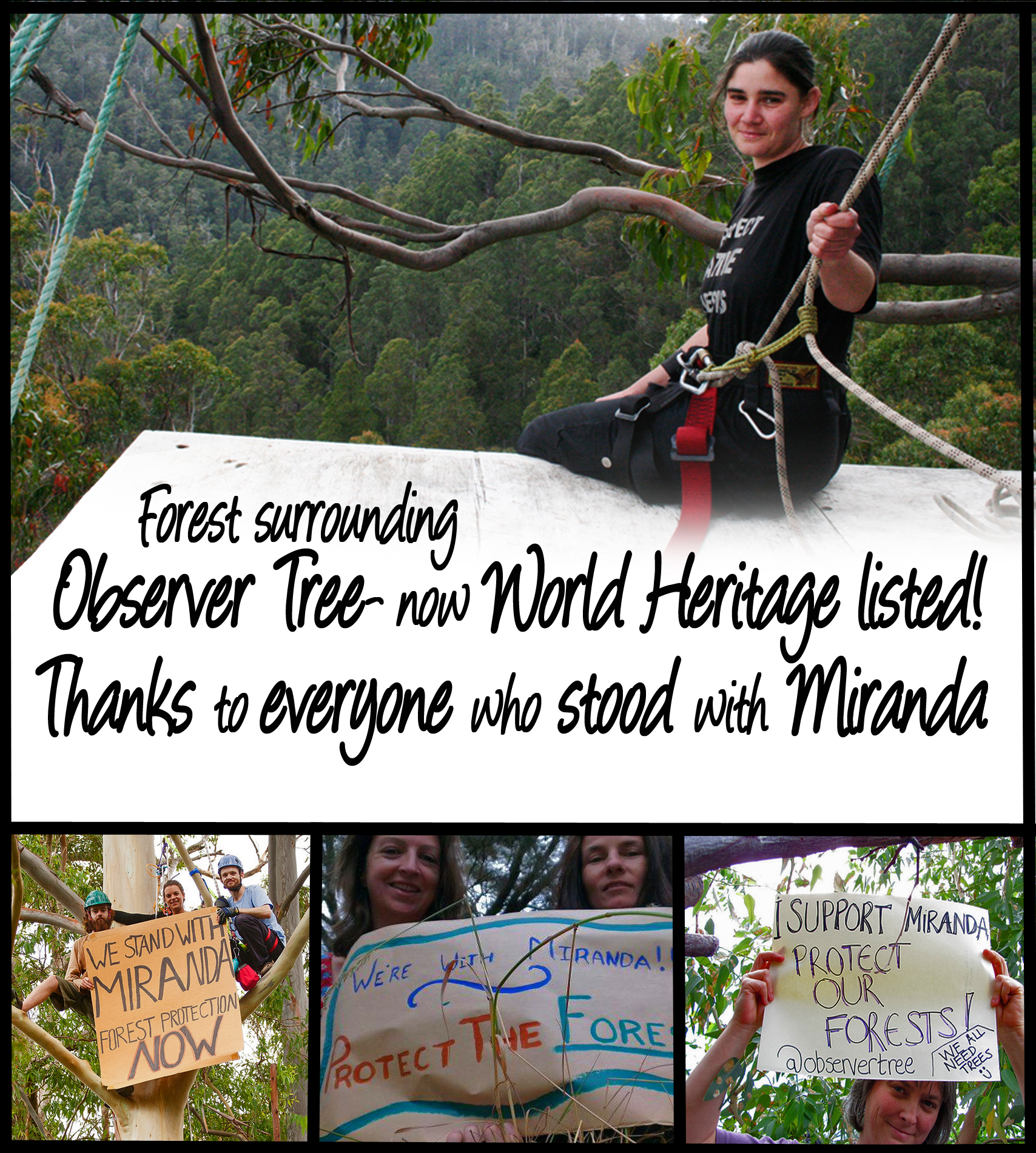“On December 14th 2011 I climbed to the top of a tree in a threatened forest and said I would stay until the forest was protected. That forest is now World Heritage. It is thanks to the support from people right around the world that the forest is still standing and is now protected” said Miranda Gibson, spokesperson for Still Wild Still Threatened.