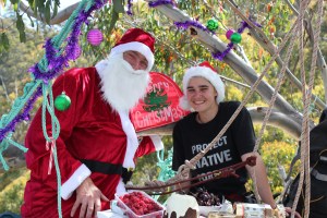 Forest conservationist Miranda Gibson was overjoyed this morning by a surprise visit from Santa Claus to her tree-top platform in Tasmanian’s southern forests. Today is Ms Gibson’s tenth day in The Observer Tree, where she is remaining to watch over the forest around her which remains under threat from logging. Mr Claus brought gifts and messages of support from the community. They shared a picnic lunch complete with Mrs Claus’s homemade plum pudding.