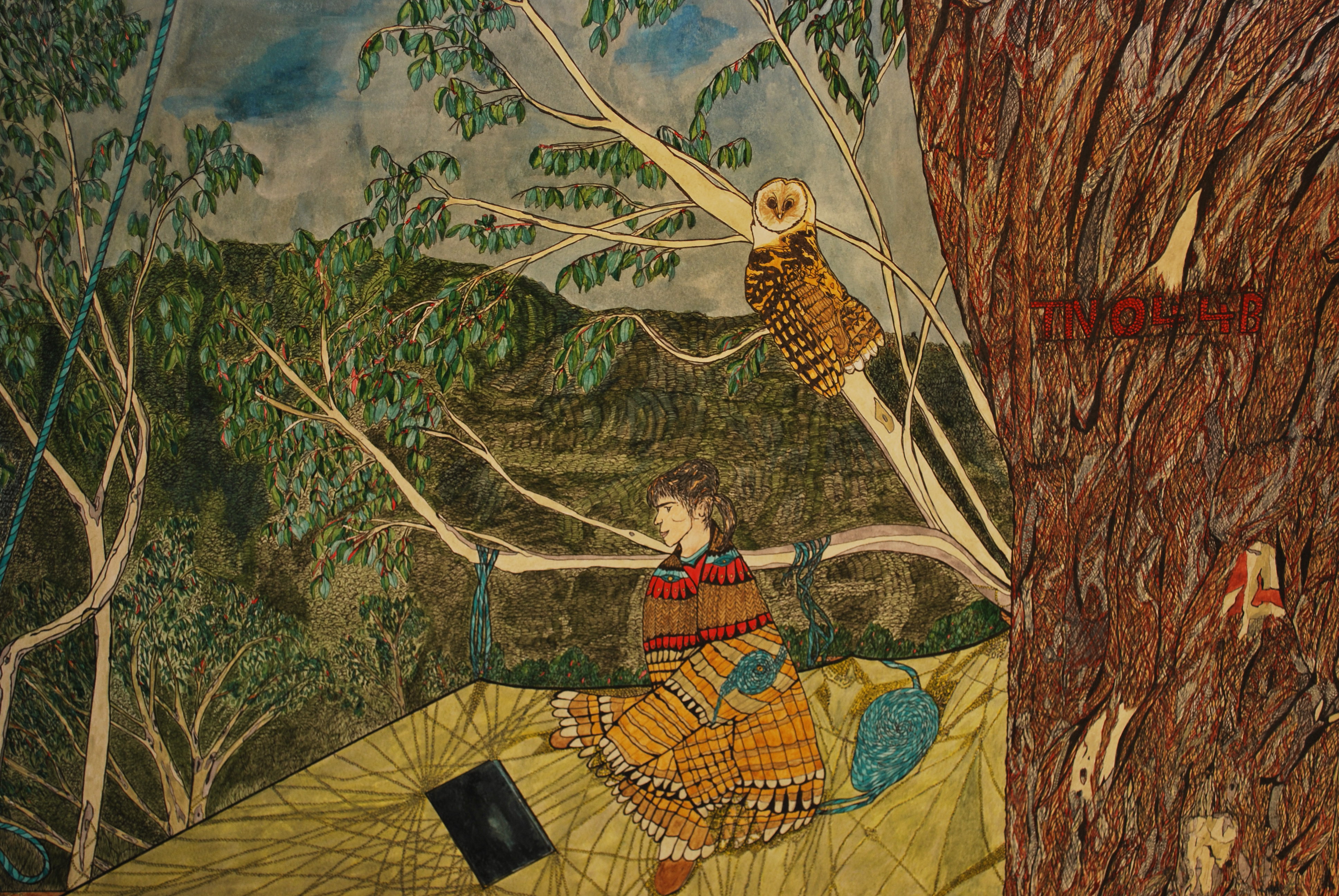 Barb Carins-Murphy – “Guardians” 80 x 60cm, Drawing and watercolour paper (mould made, acid free) unipin line pens (water & fade proof, watercolour paints), $1800