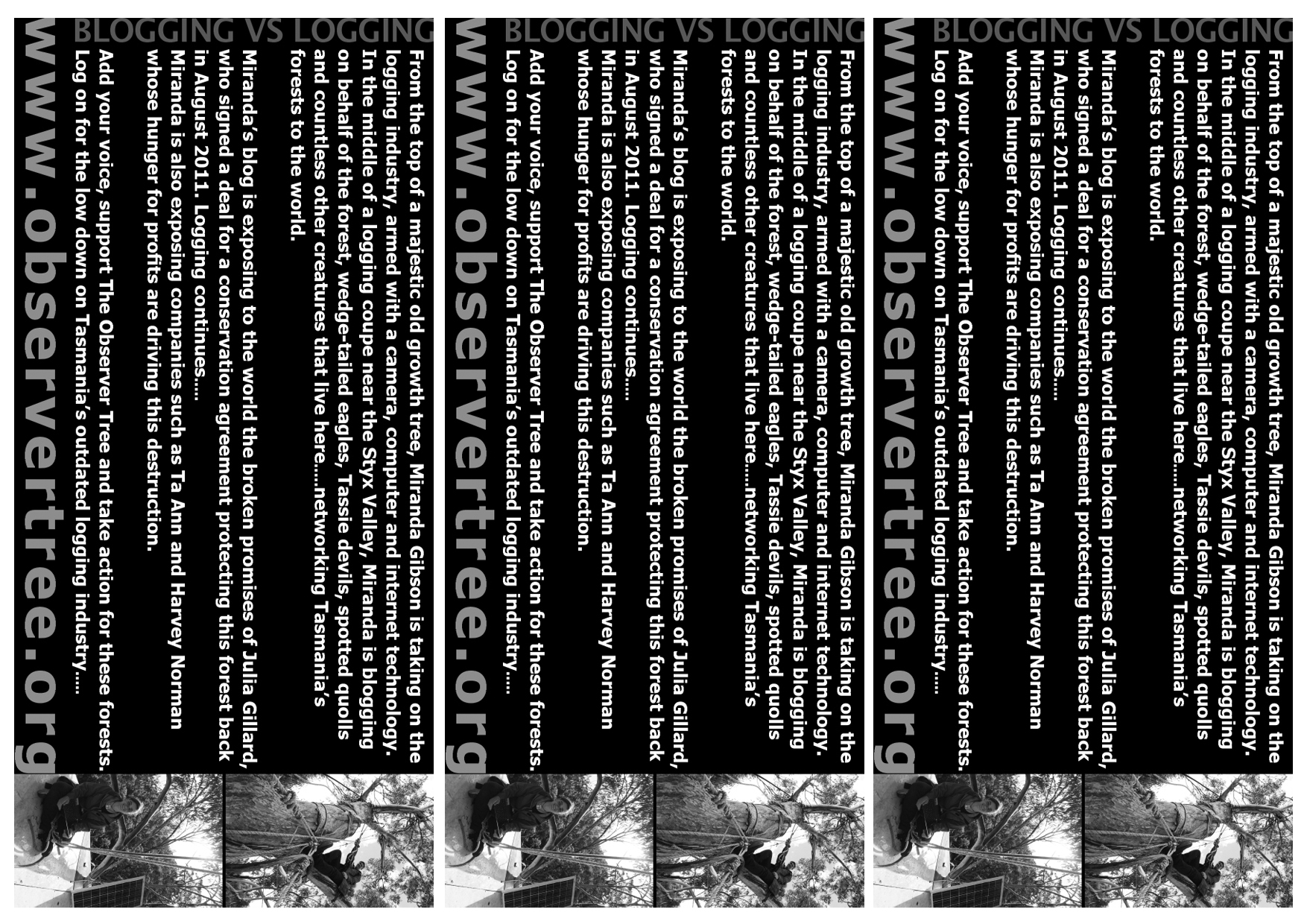2. Print out the relevent flyer or poster below. For colour posters, or if you have difficulty accessing a printer – send us an email and we can post some to you: observertree2011@gmail.com. P.s: Make sure printing is done on recycled paper 😉